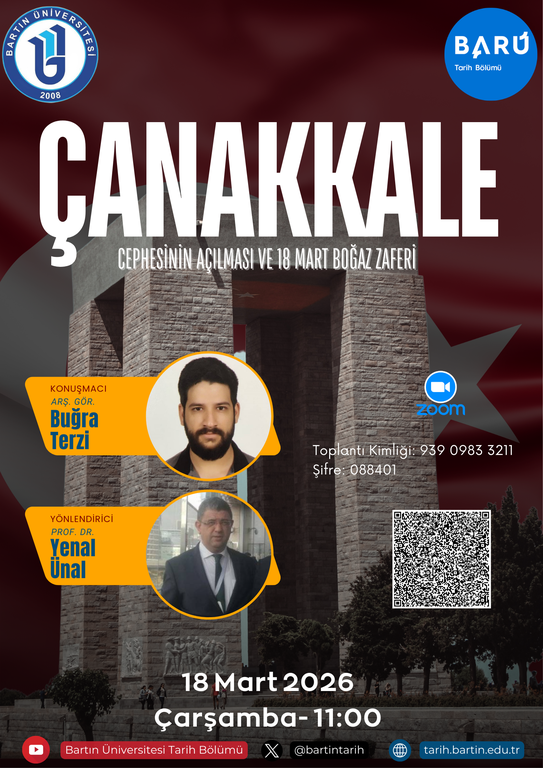 Üniversitemiz tarafından her yıl düzenlenen ve Çanakkale Savaşları’nın anlamını, önemini ve tarihsel derinliğini çok yönlü biçimde ele alan konferans etkinliği, geçmişle gelecek arasında güçlü bir bilinç köprüsü kurmayı amaçlamaktadır. Başta öğrencilerimiz olmak üzere akademik camiamıza hitap eden bu bilimsel buluşmalarda, alanın yetkin isimleri bilgi ve değerlendirmeleriyle tarihsel hafızamıza ışık tutmaktadır. Bu yıl 18 Mart 2026 tarihinde, Çanakkale Onsekizmart Üniversitesi Öğretim Üyelerinden Buğra Terzi tarafından verilecek olan “Çanakkale Cephesinin Açılması ve 18 Mart Boğaz Zaferi” başlıklı konferans, milletimizin kaderini tayin eden bu destansı mücadelenin stratejik, askerî ve tarihî boyutlarını derinlemesine ele alarak katılımcılara güçlü bir tarih bilinci kazandırmayı hedeflemektedir.