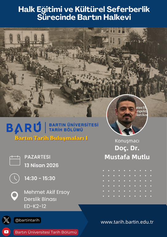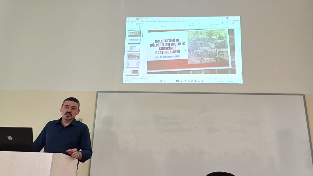 Konferans serisinin ilk etkinliğinde "Halk Eğitimi ve Kültürel Seferberlik Sürecinde Bartın Halkevi" başlıklı konuşmasıyla Doç. Dr. Mustafa MUTLU, katılımcılarla buluştu. Büyük ilgi gören etkinlik, çok sayıda akademisyen ve öğrencinin katılımıyla tamamlandı.